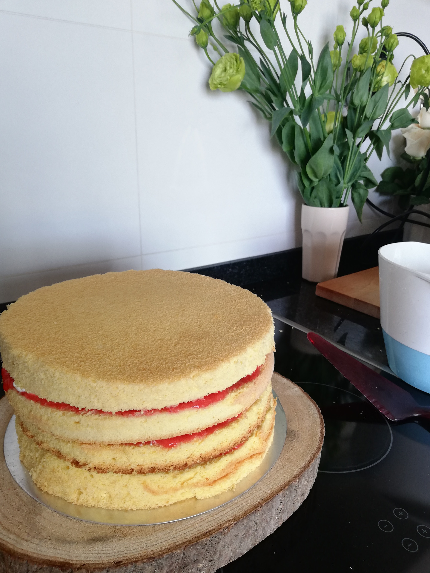 - Cortar o bolo na horizontal, ficando com 2 partes simétricas.